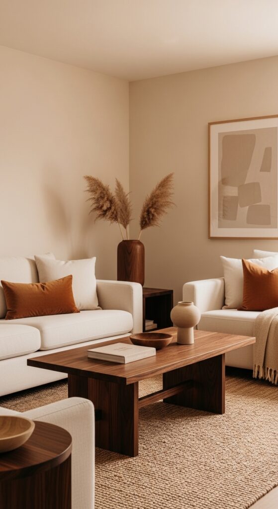 Warm greige painted walls with rich walnut wood furniture — calm, grounded, and beautifully layered.