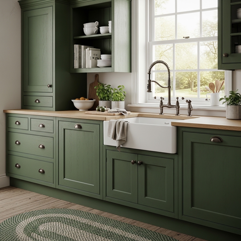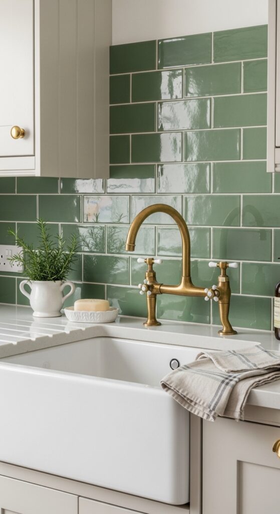 What makes it work: Green subway tile carries enormous heritage associations — Victorian butlers’ pantries, Edwardian sculleries, 1920s farmhouse kitchens — which gives it an automatic sense of history and depth. The gloss finish amplifies light and creates a beautiful reflective quality that matte tile simply cannot match, especially important in kitchens that face north or lack abundant natural light.