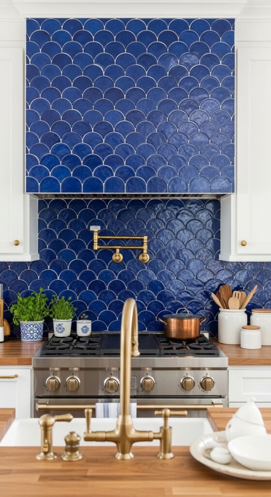 Vibe sentence: Cobalt fish scale tiles behind a stove turn cooking into something that happens in the most beautiful room in the house.
