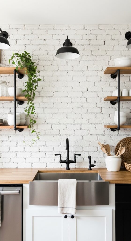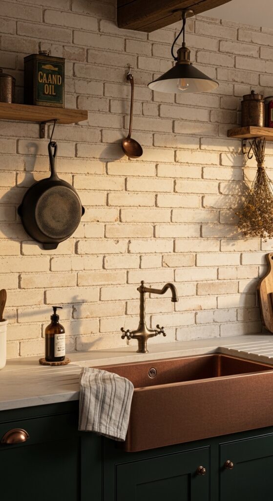 How to achieve it: Apply real brick slips (thin brick veneers) to the backsplash wall using appropriate adhesive, then apply a limewash paint (Bauwerk or Roman Clay brands work well) in thin, uneven layers with a wide brush. Allow each layer to dry before adding the next for the most authentic aged result.