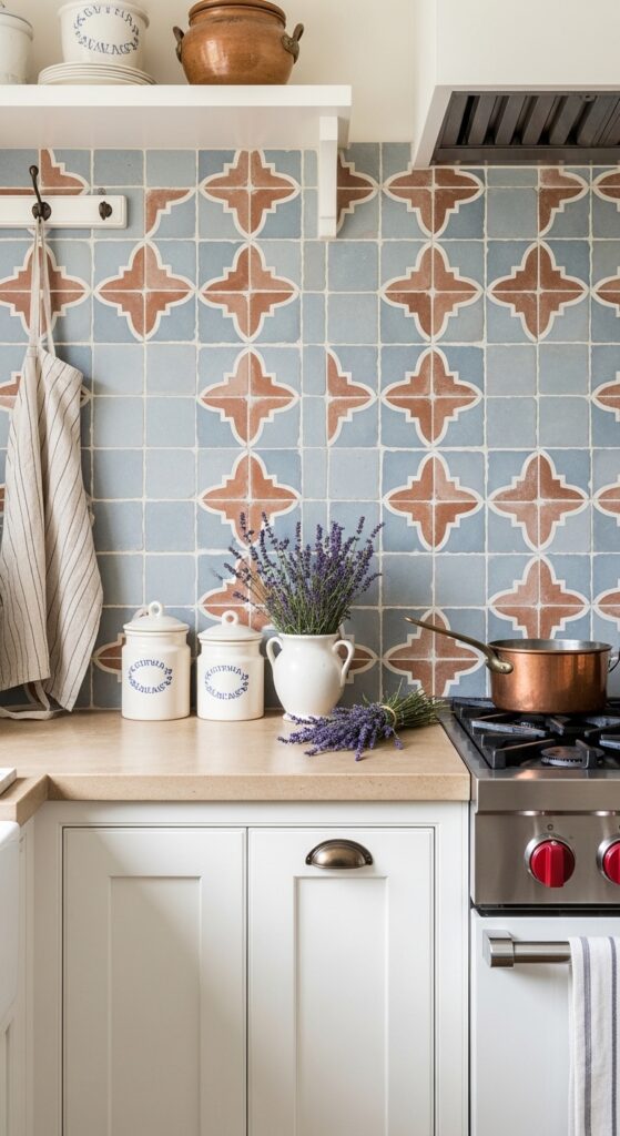 Not at all — in fact, a small kitchen can often carry more pattern than a large one, because the pattern never overwhelms when there’s less of it. The key is to use patterned tile in one zone only: either the full backsplash with simple everything else, or a focal panel behind the range with plain tile on either side. Avoid combining a patterned backsplash with patterned countertops or curtains — in country kitchens, the rule is one dominant pattern per zone, with everything else supporting rather than competing.