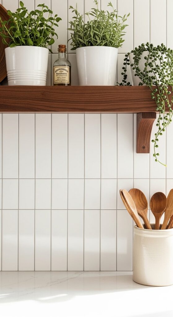 What makes it work: Rotating subway tile to a vertical stack bond orientation changes its visual character completely — the lines now draw the eye upward instead of across, adding height to any kitchen, and the pattern feels decidedly more modern and considered than the traditional horizontal brick lay. A single thick walnut shelf floating in front of the tile adds warmth and breaks the field beautifully.