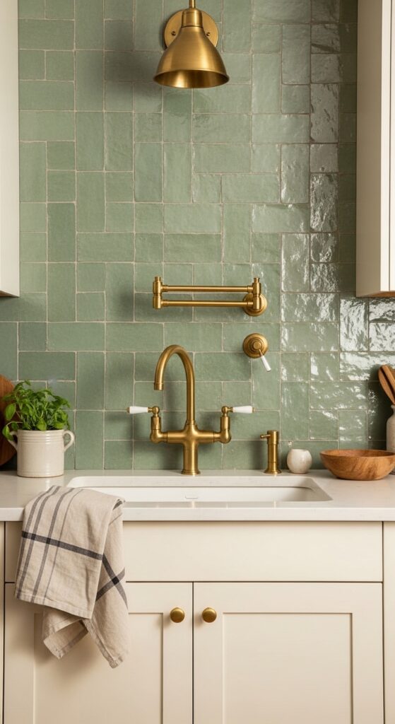 How to achieve it: Look for tiles in “sage,” “bottle green,” or “forest green” gloss from Fired Earth, Topps Tiles, or Fireclay Tile. Specify cream or off-white grout rather than bright white — it softens the contrast and reinforces the vintage character. Pair exclusively with warm brass or unlacquered bronze hardware.