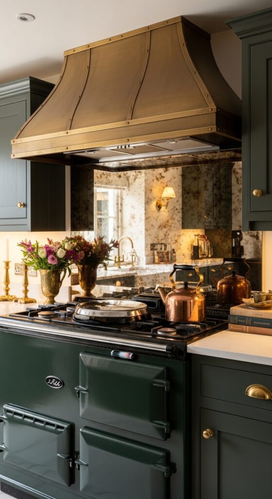 What makes it work: An antique mirror backsplash works because it does several things at once — it reflects light back into the kitchen, it creates a sense of depth and distance behind the stove, and the warm amber foxing of aged mirror glass introduces color and warmth that standard clear mirror completely lacks. It is simultaneously the most practical and most theatrical backsplash choice in this list.