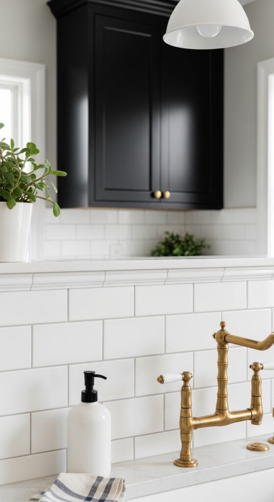 How to achieve it: Use standard 3×6 white ceramic subway tiles installed in a traditional brick offset pattern. Specify Laticrete “Charcoal” or Mapei “Charcoal” unsanded grout — both are widely available at hardware stores. Pair with cream or warm white shaker cabinets, never bright white, to keep the palette cohesive and warm.