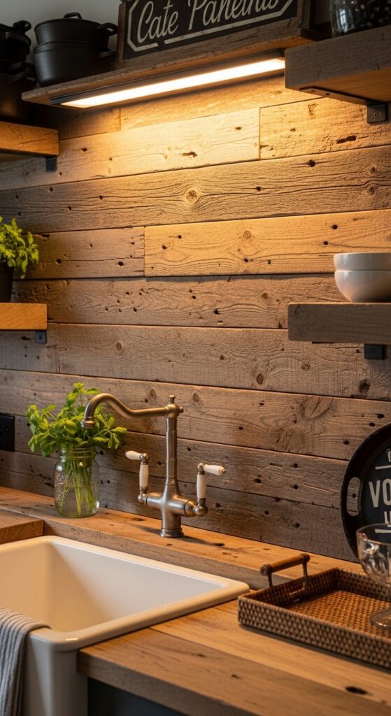 Vibe sentence: Reclaimed barn wood as a backsplash is the single most textured, most storied, most unapologetically country choice you can make.