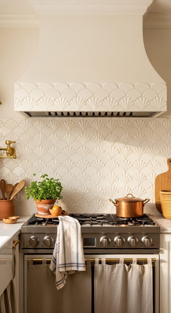 Vibe sentence: Scalloped tiles are the most inherently romantic choice in any backsplash — they look like something a French grandmother would have chosen, and she would have been absolutely right.