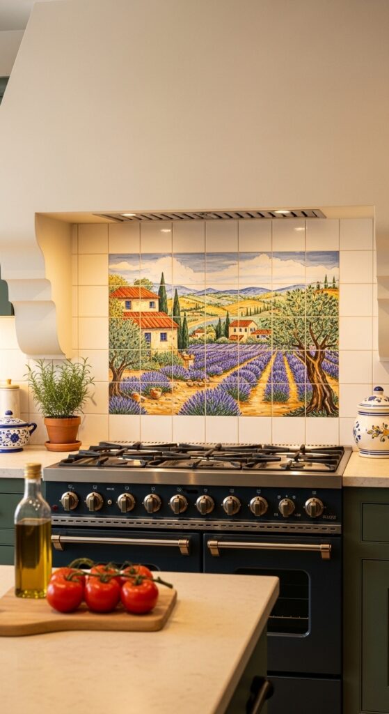 Hand-Painted Mural Tile Panel Behind the Range
