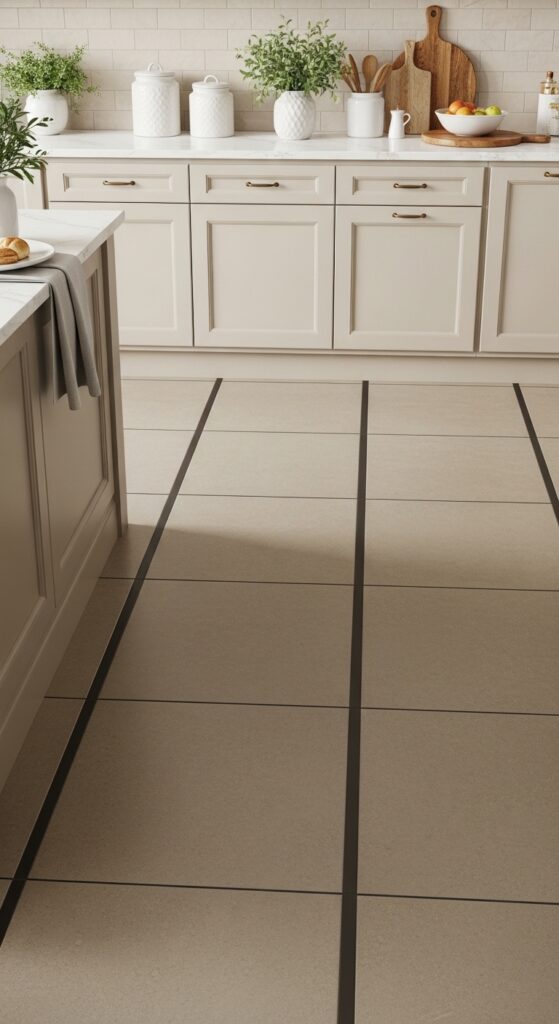 Vibe sentence: Greige tile with dark grout is the warm, grown-up version of the black-and-white grid — sophisticated enough for a design magazine, comfortable enough for a country kitchen.
