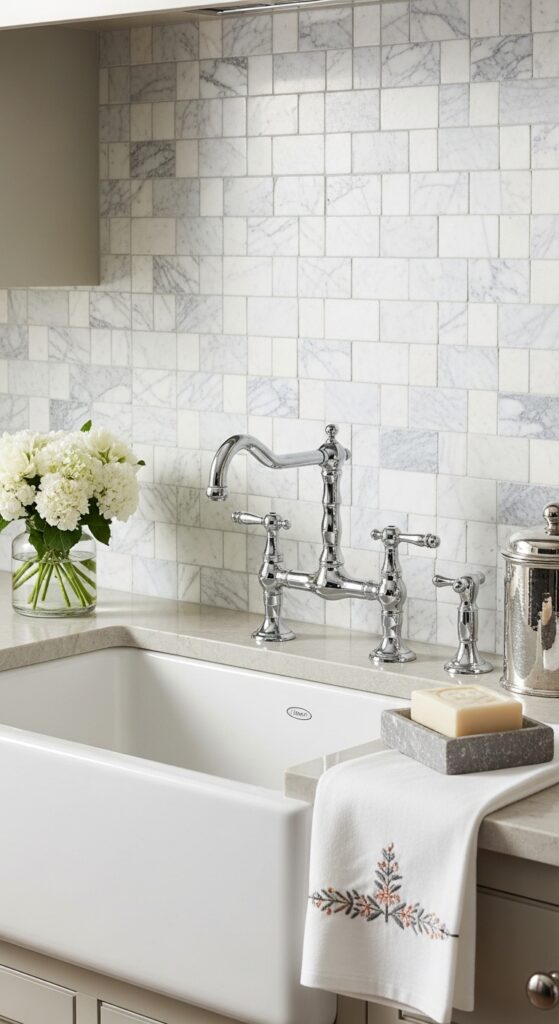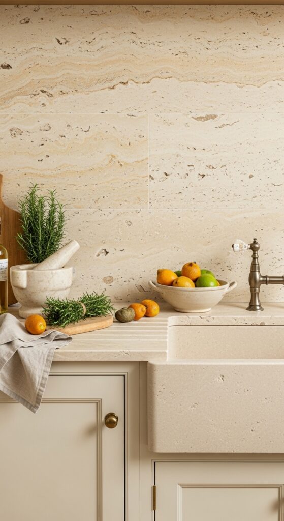 What makes it work: Honed limestone and travertine have a softness and warmth in their tones that polished marble lacks — they look like stones found in a French riverbed, which is entirely appropriate in a country kitchen. The natural variation in tone, veining, and fossil inclusions means no two slabs are alike, giving the backsplash an inherently unique quality.