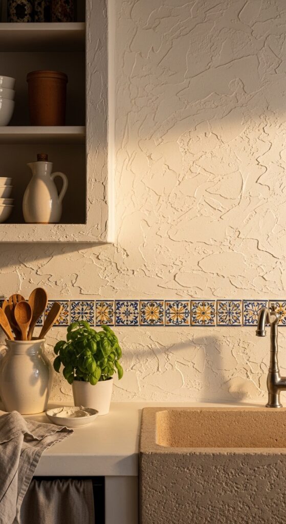 What makes it work: The combination of textured plaster as the primary surface with a single decorative tile border creates a layered visual language — the rough, organic plaster provides the backdrop, while the precision of the decorative tile introduces pattern and color at eye level. The border is both practical (protecting the most splash-prone area) and deeply decorative.