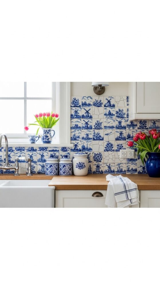 What makes it work: Hand-painted Delft tiles work on the principle of narrative texture — each tile is a miniature artwork, which means the backsplash rewards close inspection in a way no mass-produced material ever can. The cobalt-and-white palette is simultaneously bold enough to be a statement and neutral enough to work with almost any cabinet color.