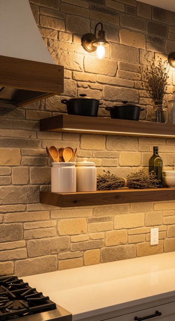 What makes it work: Reclaimed stone or tumbled brick veneer creates an unmatched sense of age and permanence. The irregular surface catches light differently across the day, creating a living, animated quality that smooth tile never achieves. Floating wooden shelves mounted against the stonework add a layer of warmth and create a practical display surface that feels completely at home against the rough texture behind it.