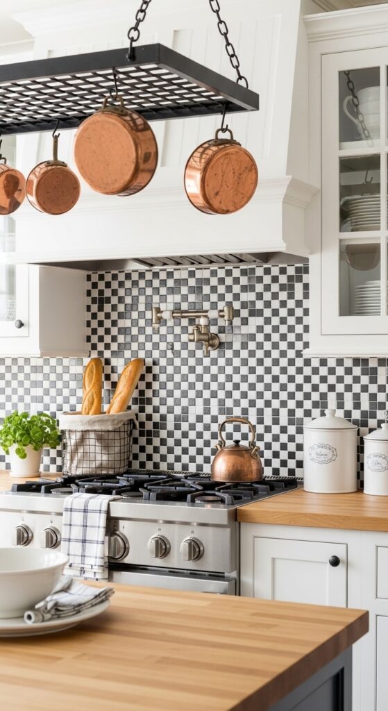 Vibe sentence: Graphic yet completely at home in a country kitchen — the checkered tile is one of those rare patterns that belongs in every era simultaneously.