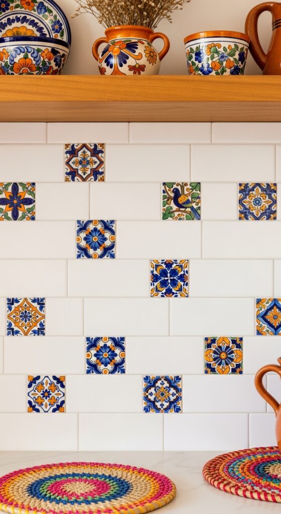 What makes it work: Using Talavera tiles as accent pieces within a neutral field tile is a masterclass in restraint and generosity simultaneously. The white subway field gives the eye a place to rest, which makes each individual painted tile feel like a gift. Spacing them irregularly — rather than in a rigid grid — reinforces the handcrafted, collected feeling.