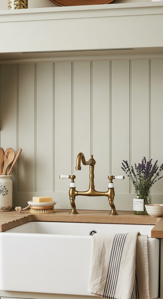 How to achieve it: Use MDF tongue-and-groove paneling boards (more moisture-stable than solid wood) and apply two coats of eggshell kitchen paint in a color like Farrow & Ball “Mizzle,” “Cromarty,” or “Pale Powder.” Seal all edges and joints with a flexible kitchen sealant where the paneling meets the countertop.