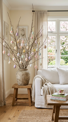 2. Pastel Egg Tree as a Living Room Focal Point