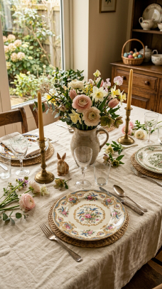 What makes it work: Mismatched vintage china creates the illusion of a curated collection gathered over years — it reads as far more sophisticated than a perfectly matched set. Botanical print napkins carry spring’s color and theme without requiring a single figurine or Easter-specific decoration.