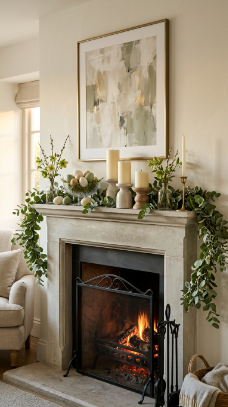 What makes it work: Trailing garland that spills slightly off both ends of the mantel creates generous, abundant energy without requiring a large volume of decor. The asymmetrical egg placement — clustered in one spot rather than evenly distributed — gives the mantel a curated, styled-but-relaxed quality.