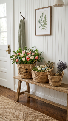 What makes it work: Using three baskets in varied sizes creates a composition that follows the classic design rule of odd-number groupings — inherently more visually interesting than two or four. Giving each basket a different content (florals, eggs, dried herbs) adds variety that rewards a closer look.