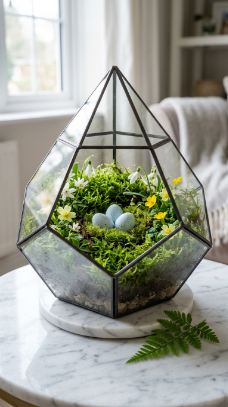How to achieve it: Use preserved sheet moss (it won’t require watering) layered over a base of pebbles inside the terrarium. Tuck decorative eggs into the moss at slightly different depths so they appear to be nestled naturally rather than placed on top.