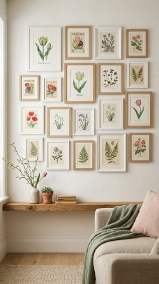 What makes it work: Botanical prints carry a timeless, educational quality — they feel less like seasonal decorations and more like art that happens to be appropriate for spring. Mixing vintage seed packet art with contemporary botanical illustrations creates a gallery wall that looks collected over time rather than assembled all at once.