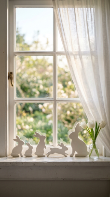 silhouette cut-outs displayed on the sill in varying sizes, backlit by morning natural light that makes them glow softly against a sheer white linen curtain. Lighting: bright natural backlit morning light. Camera angle: eye-level. Mood: soft and whimsical. Key details: silhouette-only bunny forms with no facial features, varied sizes, warm window glow through sheer linen. Decor accents: a small bud vase of white tulips beside the largest bunny, a white-painted windowsill. Color palette: pure white, warm ivory light, sheer linen, soft morning glow. Style tags: photorealistic, 8K resolution, interior design photography, Pinterest vertical 2:3 ratio, no people, magazine quality.