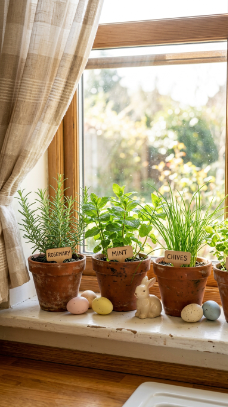 What makes it work: Integrating seasonal Easter accents (eggs, a small ceramic bunny) among functional herb pots creates a display that feels organic rather than staged. The terracotta of the herb pots carries a warm earthiness that pairs beautifully with spring greens and pastel accents.