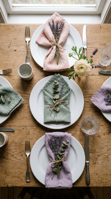 How to achieve it: Dye plain white linen napkins with Rit Dye in pastels — use less dye than recommended for a faded, washed-out result that looks intentional. Tie each napkin with a sprig of dried lavender or a single flower stem for a detail that functions as both décor and a guest gift.