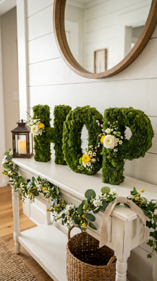 What makes it work: Large letter forms create immediate graphic impact that smaller decor cannot. Covering them in preserved sheet moss adds texture and color simultaneously, while the Easter-adjacent word “HOP” communicates the season without resorting to overtly themed decoration.