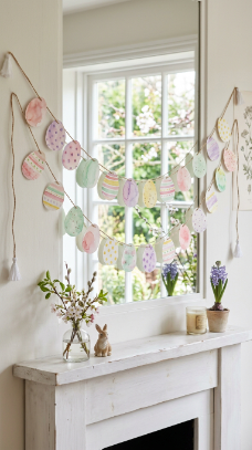 What makes it work: Watercolor washes on cut paper eggs create a translucency that catches window light beautifully, making the garland glow rather than simply hang. The handmade quality is the point — slight variations in each egg add character that a printed or manufactured garland cannot replicate.