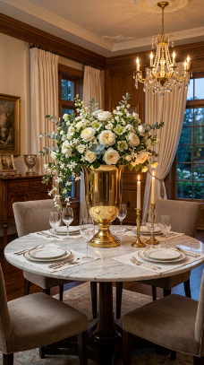What makes it work: Brass has experienced a significant interior design revival and reads as simultaneously traditional and contemporary. An overflowing, slightly imperfect arrangement — with jasmine trailing over the urn’s edge — softens the formality of the brass and creates an effortlessly luxurious look.