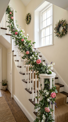 20. Staircase Banister Garland with Spring Flowers
