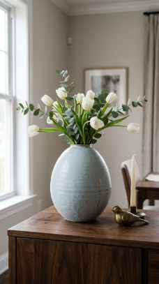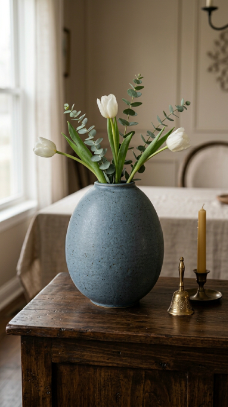 How to achieve it: Look for egg-shaped vases at ceramic studios, Etsy shops, or West Elm. A matte glaze in pale blue, sage green, or warm cream reads as most sophisticated. Because the opening is typically small, only a handful of stems are needed — which keeps the arrangement cost low.