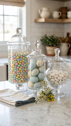 22. Apothecary Jars Filled with Pastel Candy and Eggs