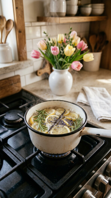 How to achieve it: Combine sliced lemon, a few sprigs of fresh rosemary, a tablespoon of dried lavender, and half a vanilla bean in a small pot of water. Simmer on the lowest heat setting for one to two hours before guests arrive, adding water as needed. For an Easter-specific variation, add a cinnamon stick and a few cardamom pods for warmth.