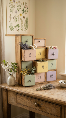 How to achieve it: Source a wooden advent-style box from Amazon, Etsy, or craft stores and repaint in Easter pastels using chalk paint — it requires no sanding and adheres beautifully to wood. Fill boxes with small treats, notes, flower seeds, or tiny trinkets for children to discover each day leading up to Easter.
