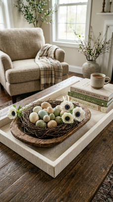 What makes it work: Dough bowls carry a functional, historical quality that elevates whatever is placed inside them. The contrast between the rough, hewn wood and the smooth porcelain surfaces of decorative eggs creates satisfying tactile contrast. Adding real or faux anemone stems bridges the gap between decor and florals.