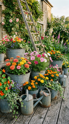 Vintage galvanized metal tubs planted with cottage flowers are effortlessly farmhouse.