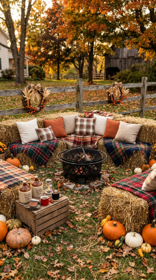 Hay bales draped with plaid blankets create the coziest rustic autumn gathering spot.