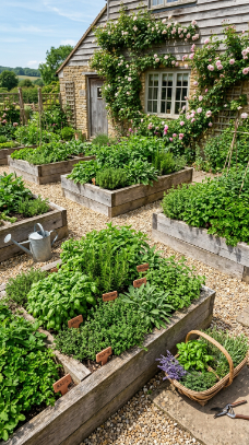 Neat raised timber beds overflowing with culinary herbs bring farmhouse function and beauty.