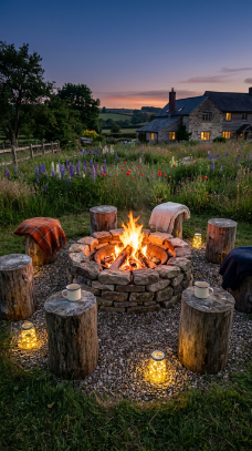 A hand-stacked stone fire pit surrounded by log stumps is pure farmhouse evening ritual.