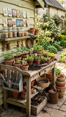 A well-loved potting bench loaded with terracotta, tools, and seedlings is pure joy.