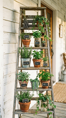 A weathered wooden ladder leaned against the porch becomes the perfect vertical garden.