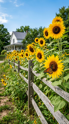 A row of giant sunflowers planted along a weathered fence transforms summer beautifully.