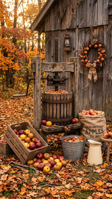 An antique cider press styled with apples and harvest goods makes autumn feel complete.