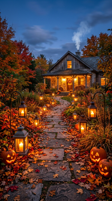 Paper bag lanterns filled with autumn leaves and candlelight line the farmhouse path magically.
