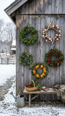A timber wall hung with multiple handmade seasonal wreaths becomes outdoor farmhouse art.