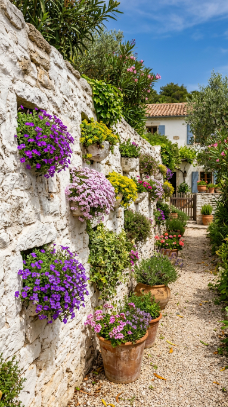 A whitewashed stone wall with built-in planting pockets spills with seasonal color all year.