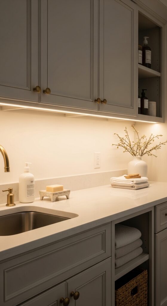 What makes it work: Good lighting sharpens the entire room and makes counters, shelves, and storage feel more intentional. Under-cabinet strips also reduce shadowy work areas, which matters when sorting stains or folding dark clothing.